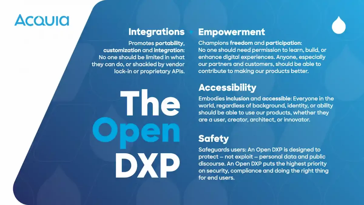 Quieren que contratar Acquia no sea solo comprar ese software, sino que además tendrá acceso a un ecosistema tecnológico abierto con integraciones de todo tipo y donde todos puedan participar y contribuir. La estrategia sigue apostando por un DXP, pero con un enfoque más abierto y orientado hacia el empoderamiento, la inclusividad, la accesibilidad y la seguridad.