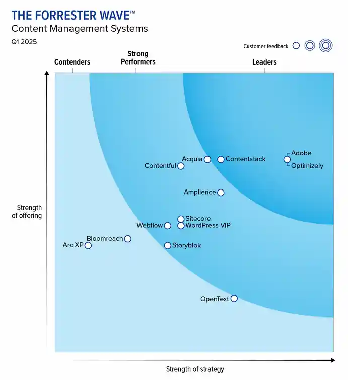 Forrester, en su informe de inteligencia, considera que los líderes, los que aúnan la mejor estrategia y la mejor oferta son en primer lugar y empatados, Optimizely y Adobe, seguidos ya de lejos por Contentstack.