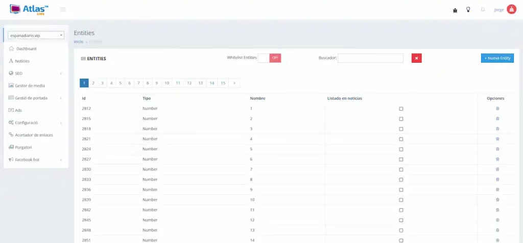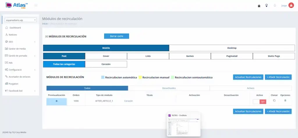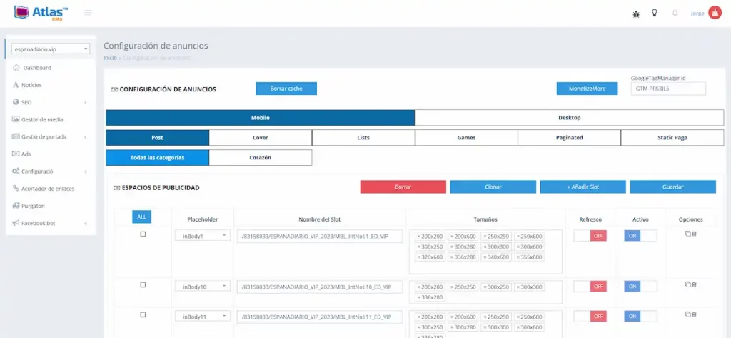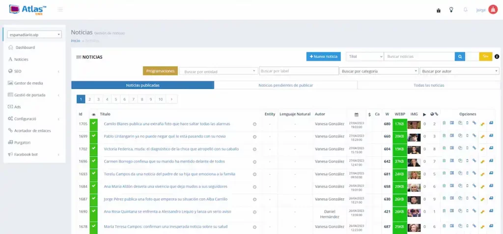 Atlas CMS cuenta con gestión de tags, categorías, autores, menú, branded content y autores de fotos diferenciados de los usuarios del CMS. Además, tenemos un acortador de enlaces para usar en redes sociales y un sitio donde purgar la caché en el caso de que sea necesario.