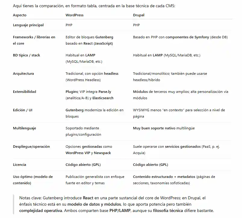 En la siguiente imagen puedes ver una comparativa de la tecnología en la que basa Drupal frente a la de WordPress. Así es muy fácil elegir CMS: