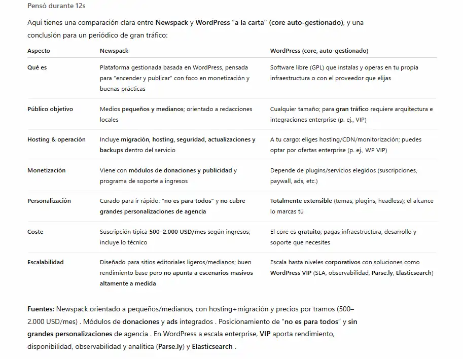 Y a continuación CMS MAG GPT te muestra una nueva comparativa, esta vez de características entre un WordPress autoalojado frente a la propuesta de Automattic para periódicos locales, Newspack:
