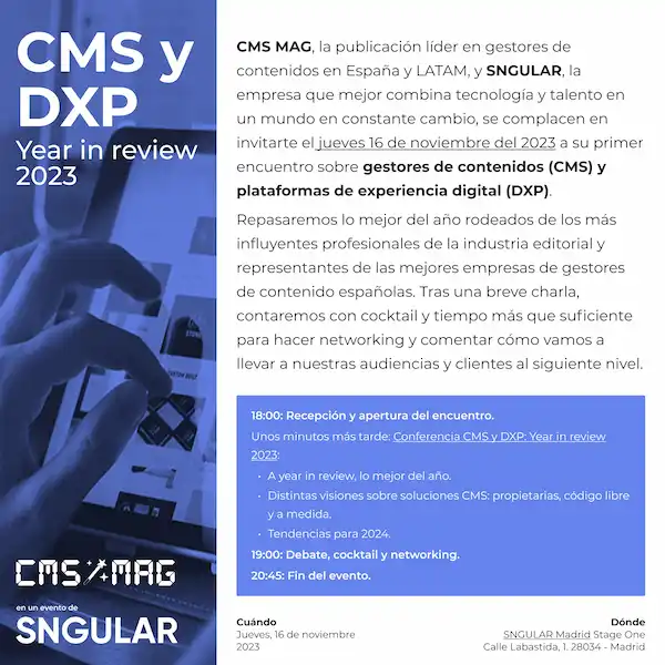 CMS MAG, la publicación líder en gestores de contenidos en España y LATAM, y Sngular, la empresa que mejor combina tecnología y talento en un mundo en constante cambio, nos hemos unido para celebrar un exclusivo evento en torno a los gestores de contenidos (CMS) y plataformas de experiencia digital (DXP) que seguro que va a dar mucho que hablar.