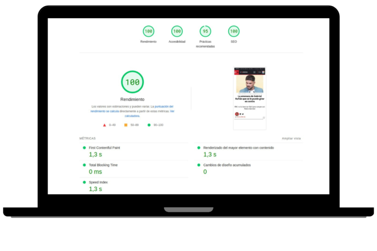 Dedicados a alcanzar resultados óptimos, nos aseguramos de cumplir plenamente con Core Web Vitals, garantizando así una evaluación positiva por parte de Google para tu medio.