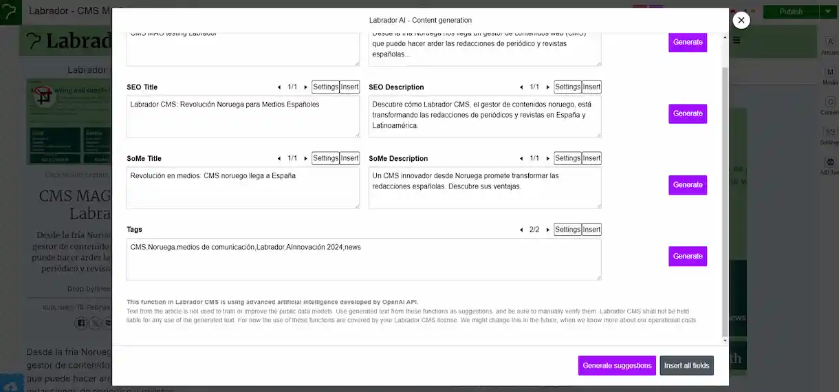 La implementación de la inteligencia artificial (IA) en Labrador CMS se basa en la idea de que el proceso de publicación sea lo más rápido y sencillo posible (de hecho, para publicar, cuando se está en la noticia solo hace falta pulsar la letra P del teclado), ahorrando tiempo al periodista. La IA siempre tiene que estar al servicio del periodista y jamás debe crear contenido de cero, sino que suele trabajar con el contenido ya generado por el redactor.