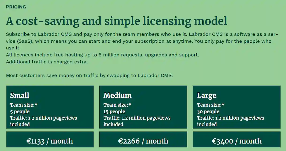 Otro de los puntos fuertes de Labrador es su transparencia con el asunto de los precios así como que resulta muy económico de partida, lo que puede hacer las delicias de gran parte de los pequeños periódicos que existen en España. Para estos medios pequeños que tanto abundan en nuestro país ya se puede acceder a Labrador desde solo 1133 euros al mes para una redacción de hasta 5 personas y 1.2 millones de páginas vistas incluidas. El precio incluye actualizaciones y soporte o atención al cliente.