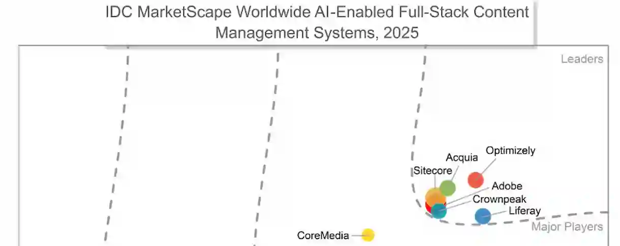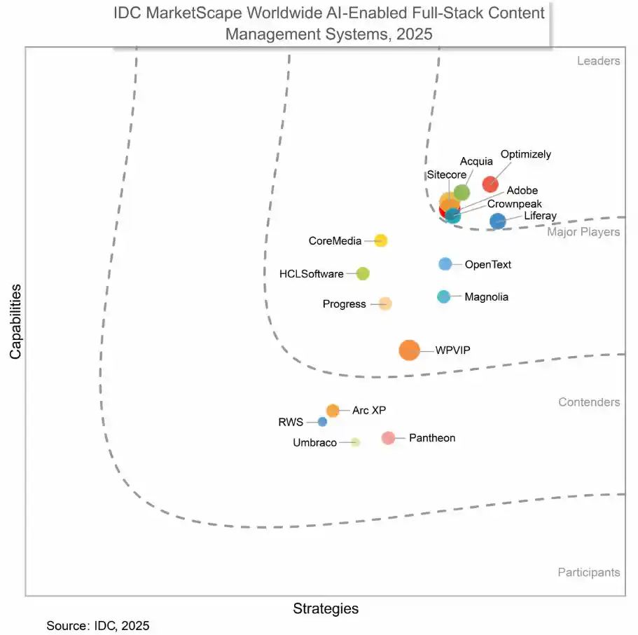 En este ranking de IDC, Liferay comparte liderato con Crownpeak, Adobe, Optimizely, Acquia y Sitecore. Un escalón por debajo, tal y como se puede apreciar en la imagen, encontramos a CoreMedia, HCLSoftware, Progress, WP VIP, Magnolia y Open Text. Serían para IDC los que estarían por debajo de los líderes, pero son jugadores importantes. Y en un último escalón destacan Arc XP, Pantheon, Umbraco y RWS.