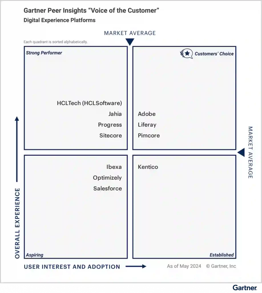 Situarse en el cuadrante superior derecho es realmente positivo para Liferay, puesto que supone un espaldarazo por parte de los propios clientes, quienes son decisivos en esta clasificación. Liferay se coloca así como una de las opciones preferidas por los clientes de todo el mundo, junto a Adobe y Pimcore.