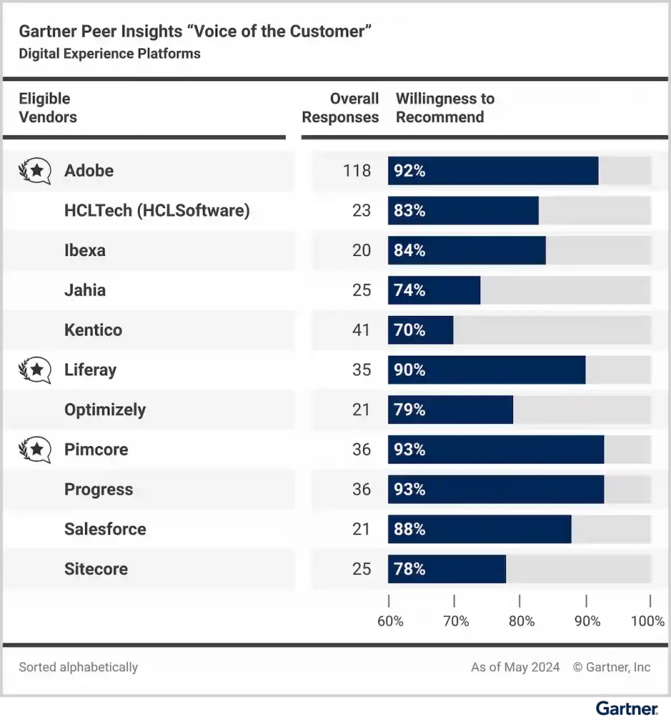 “Voice of the Customer” es un completo informe que aglutina opiniones generalizadas, junto con otras individuales más detalladas y la investigación de los expertos de Gartner para ofrecer una información que es muy valorada en el proceso de compra y adopción de cualquier software DXP para la empresa.