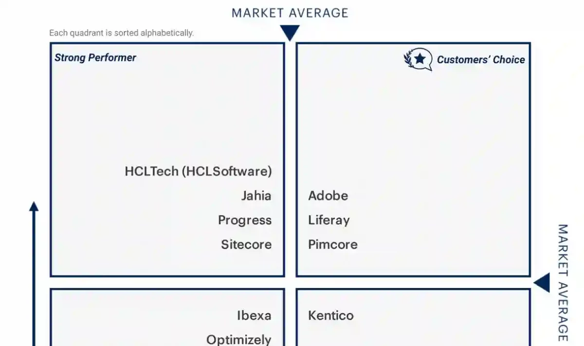 Situarse en el cuadrante superior derecho es realmente positivo para Liferay, puesto que supone un espaldarazo por parte de los propios clientes, quienes son decisivos en esta clasificación. Liferay se coloca así como una de las opciones preferidas por los clientes de todo el mundo, junto a Adobe y Pimcore.
