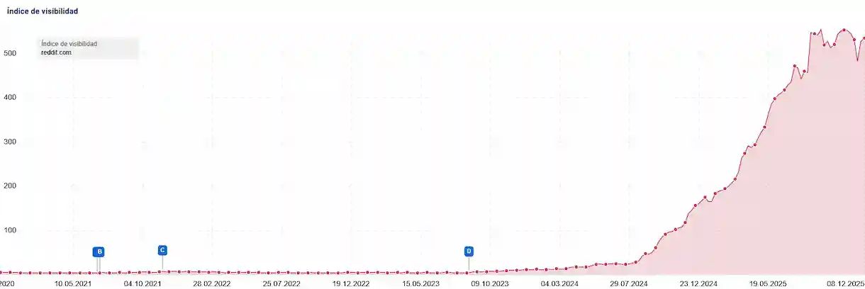 La inmensa subida en poco más de un año, superando como decíamos a gigantes como Amazon, cuando antes era un sitio web residual, despierta mis más bajos instintos, pero voy a optar por morderme la lengua a un a riesgo de envenenarme. Al final, estamos hablando -creo- de una de las subidas de tráfico más impresionantes de todos los tiempos y la imaginación y la intuición dicen que ha sido más para generar AI Overviews que debido a un gran y repentino aumento de la calidad de un sitio en el que básicamente son los usuarios los que generar contenido.