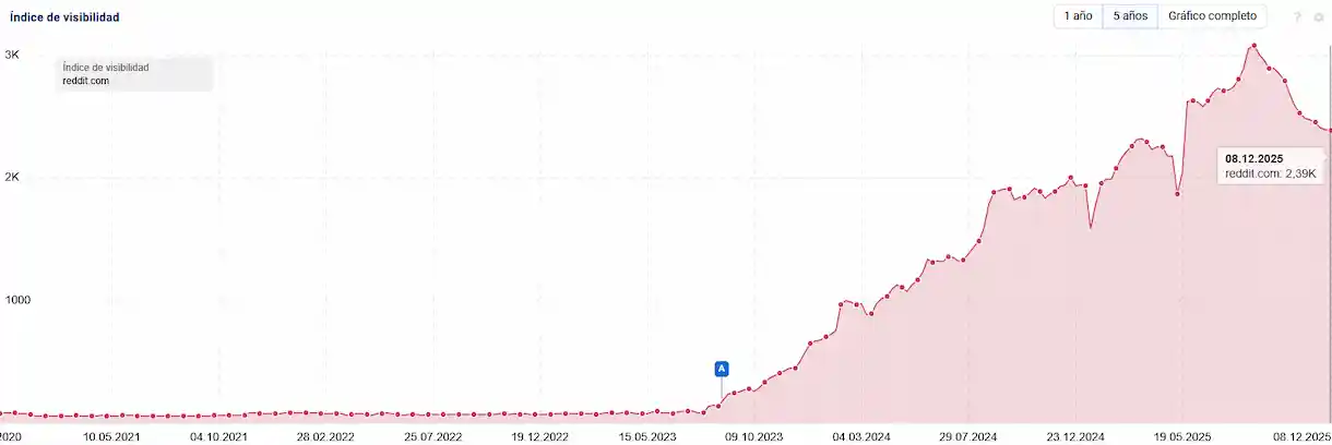 La mala noticia es que Reddit, que tengo entendido que contrató gente para España recientemente, sigue gozando de una inusitada popularidad con más de 500 puntos de visibilidad y sin visos de caer pese a que todo está traducido del inglés con IA (por comparar, el periódico El País solo tiene 308 puntos de visibilidad).