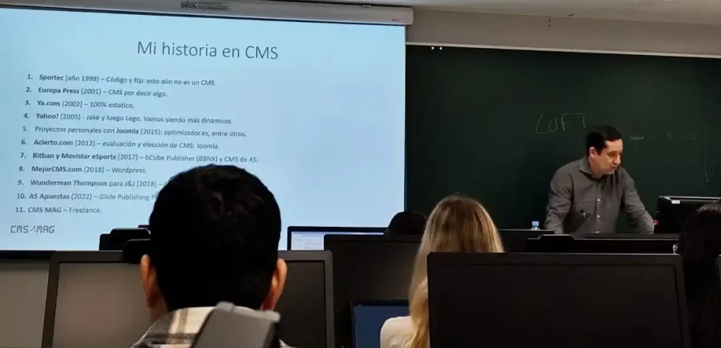 La parte final, y esto ha sido la novedad de este año, es que gracias a mi evento de IA en los CMS celebrado recientemente he podido conseguir información de primera mano y se la he podido ofrecer a los alumnos. Les he comentado una serie de usos de la IA que ya están en funcionamiento en los CMS y otros que aún no están presentes, pero que pueden estarlo en breve.