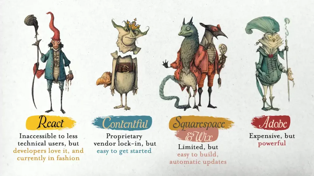 En el comienzo del cuento, a mi juicio, compara Drupal con otros CMS como Adobe, Squarespace, Contentful y otros CMS. La comparación no sé si es del todo acertada, porque Drupal no compite con Adobe, a nivel de gran empresa lo hace Acquia, que por otro lado tampoco es precisamente barato.