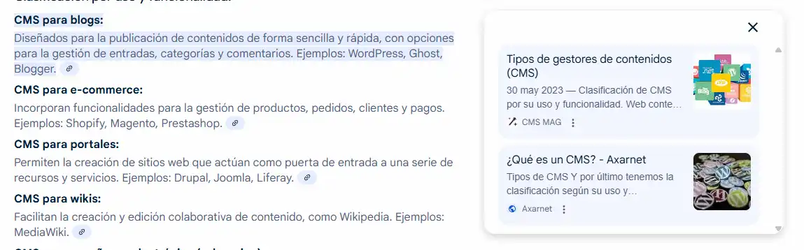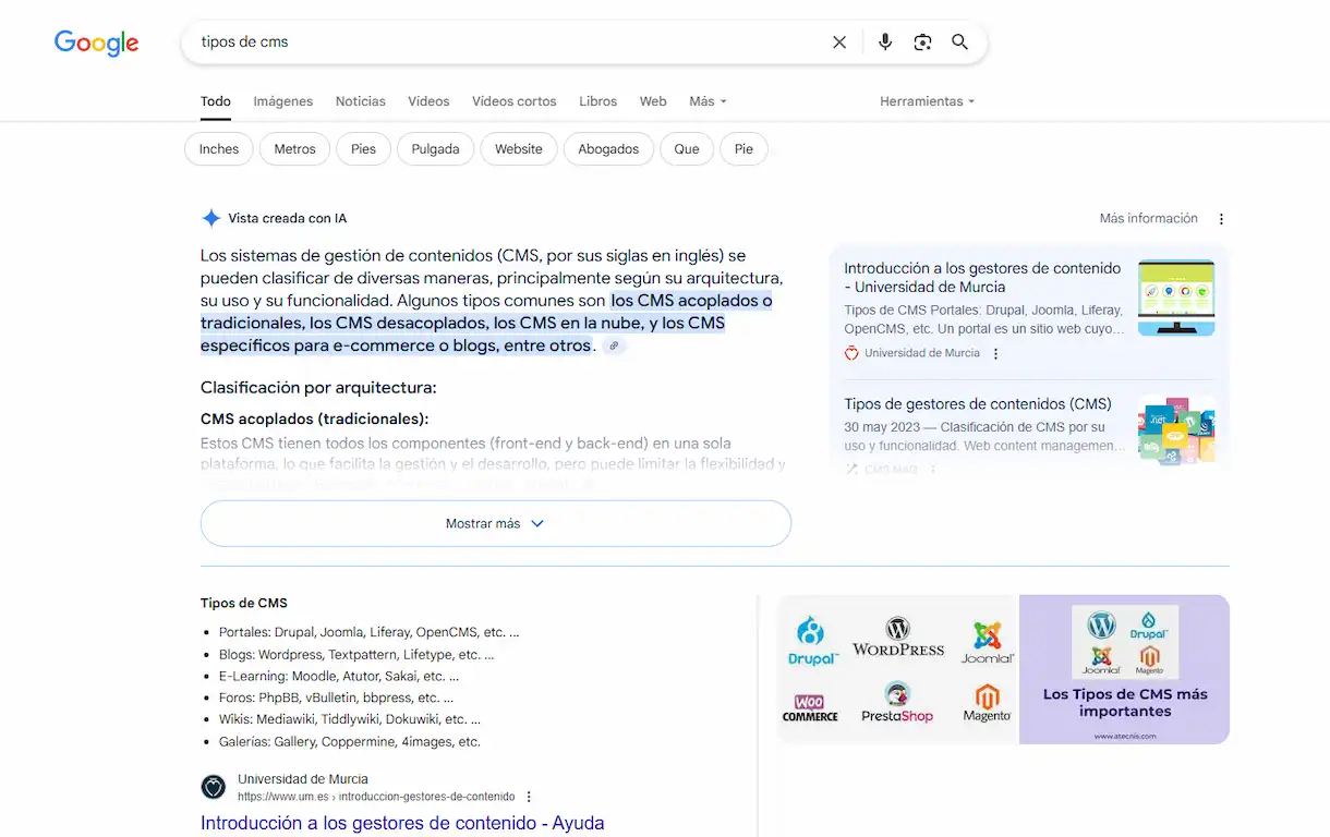 Una de las búsquedas que tradicionalmente más tráfico me ha dado ha sido la de “tipos de CMS”. Desde que la hice, multitud de gente ha venido y me la ha copiado sin ni siquiera pone un enlace, pero ese no es el tema que nos ocupa hoy. El caso es que esta “query” ya me daba menos tráfico porque la página envejeció y, a pesar de tener todavía el mejor contenido, calló un poco en el ranking.