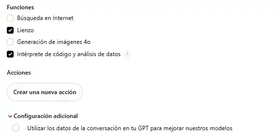Y, en segundo lugar, el propio GPT ofrece en la sección de configuración avanzada (la única opción escondida en un desplegable) de usar los datos de las conversaciones en tu GPT para mejorar sus modelos. El hecho de que exista esta opción me convenció de subir mis datos, pero hay que hacer un acto de fe para que la empresa norteamericana realmente respete mis deseos. Realmente me gustaría poder utilizar un servicio europeo…