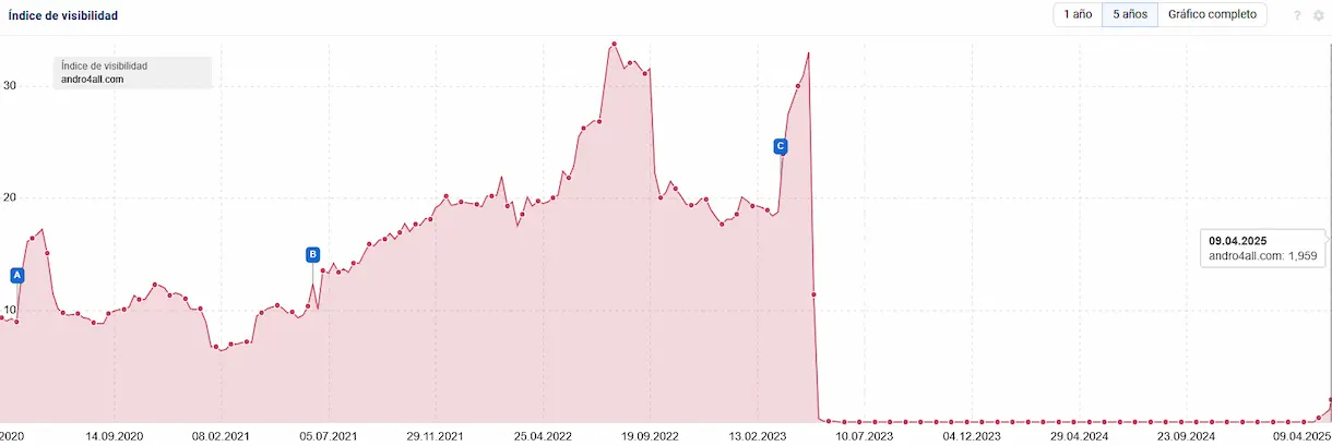 Veamos el gráfico de Andro4all en el que se aprecia claramente cómo este site pasó al dominio de La Vanguardia en 2023 y ahora que ha recibido la penalización y se ha tenido que volver a su dominio original, no levanta cabeza.
