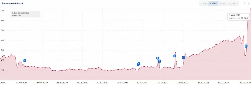 En este sentido, se sigue observando que varios sitios de contenido generado por el usuario (UGC), y es especial Quora, han subido mucho (Reddit en España un poco menos), de forma que el UGC, anteriormente denostado por Google, parece que cobra nueva vida e importancia en la era de la IA.