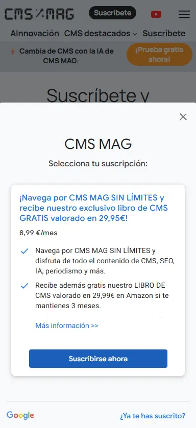 Sigue los pasos para completar la suscripción. Una vez completada, tan solo haz login o inicio de sesión con un navegador Google Chrome con la cuenta con la que hayas contratado la suscripción y podrás visitar todo el contenido de CMS MAG sin restricciones.