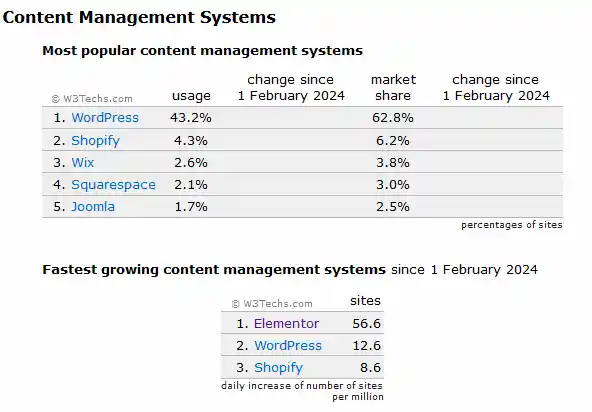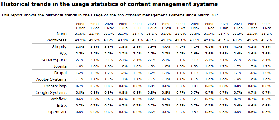 Hace cierto tiempo que no hablamos de la lista de los CMS más usados según indica W3Techs. Y la razón es que, en general y excepción hecha de Shopify, las cifras llevan tiempo bastante estables y en los últimos meses no hay cambios significativos.