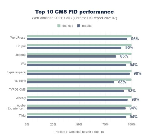 El caso es que se consideran que un FID bueno debe estar por debajo de los 100 milisegundos y prácticamente todos los CMS lo consiguen: