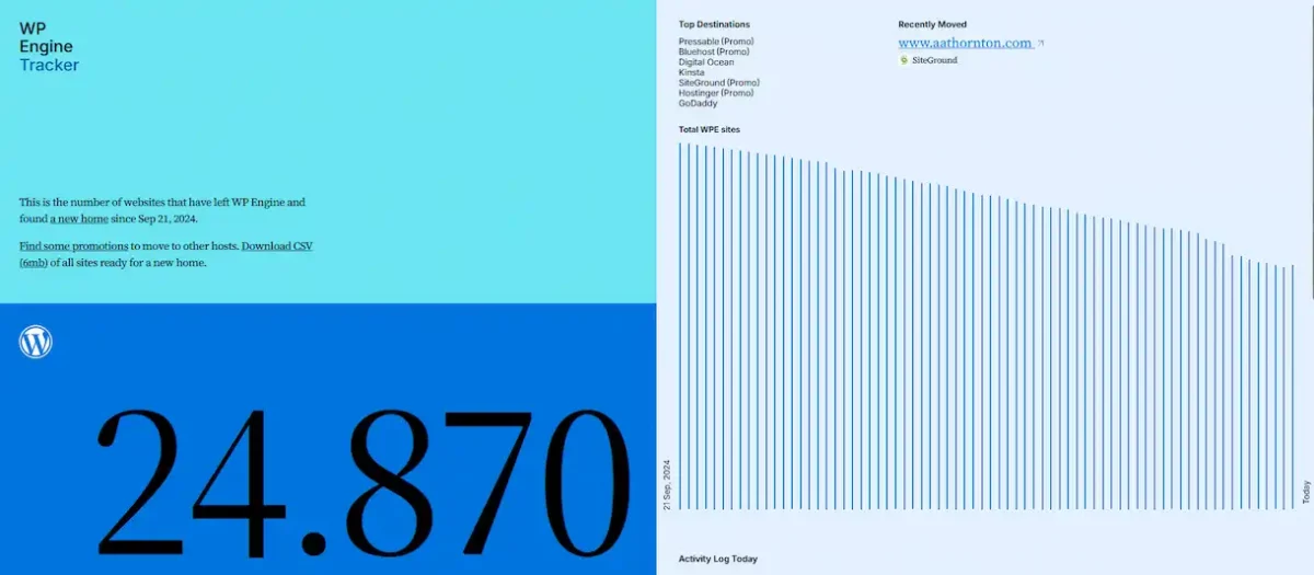 Esta página, que es una medida de presión más contra WP Engine en medio de una disputa legal, parece estar teniendo bastante éxito, según la propia web, puesto que en la publicación de dicha web el número de web alojadas en WP Engine a finales de septiembre era de 745.000 y en la actualidad son ya solo poco más de 700.000. De todas estas bajas, en el momento de escribir este artículo, la página WP Engine Tracker presume de haber convencido a casi 25.000 webs de cambiarse.